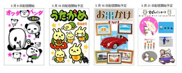 配信ラインナップとしては、当社のデコメール総合サイト「デコデコメール」内で人気のキャラクター「うたがめ」、「オワタパンダ」、「すぽんじニャーコ」に加えて、お出かけのお誘いの時に最適な車の発進音などの効果音付スタンプも、提供してまいります。