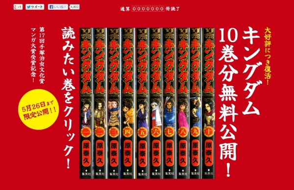 「週刊ヤングジャンプ」にて好評連載中で、第17回手塚治虫文化賞(朝日新聞社主催)のマンガ大賞を受賞した『キングダム』(作:原 泰久)のコミックス1~10巻にあたる2,000ページ以上を、5月13日(月)から5月26日(日)まで特設サイトにて無料公開いたします。特設サイトでは会員登録なしでPCやスマートフォン・タブレット端末から閲覧することができます。