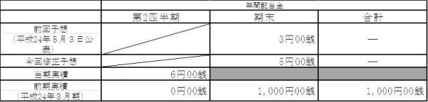 ※当社は、平成24年7月1日付けで普通株式1株につき100株の割合で株式分割を行っております。また、平成24年10月1日付けで普通株式1株につき2株の割合で株式分割を行っております。これに伴い、平成25年3月期(予想)の期末配当については当該株式分割の影響を考慮して記載しております。なお、当該株式分割を考慮しない場合の年間配当金は16円(第2四半期末6円、期末10円)となります。