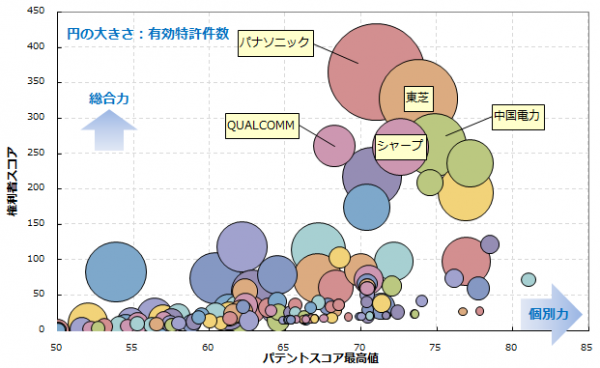 近年、自然エネルギーによって発電した電力の発電量と蓄電量を監視しつつ、家電などの消費電力量を制御する技術が注目を集めています。2012年4月からは、経済産業省による家庭用エネルギー管理システム及びビル向けのエネルギーマネジメントシステムの補助金制度も実施されています。そこで本調査では、主に家庭用エネルギー管理システム関連技術の特許を抽出し、各個別特許の注目度を得点化する「パテントスコア」をベースとして、特許の質と量から総合的に見たランキングを作成しました。