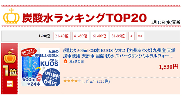 九州の美味しい天然水から生まれた炭酸水「KUOS-クオス-」が、発売開始よりわずか2ヶ月で2,500ケース(1ケース500ml×24本入り)の販売、そしてついに楽天ランキングで1位を獲得しました。(5月15日)