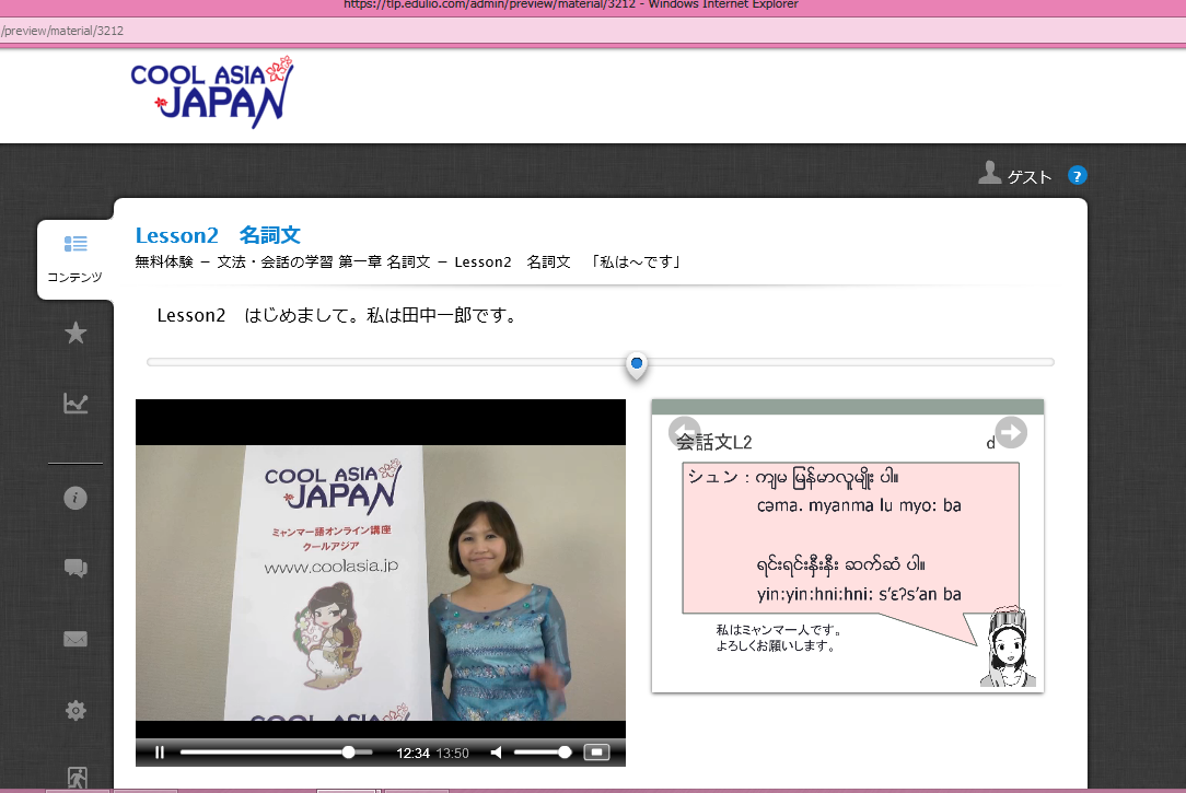 eラーニング講義には、日本人が慣れ親しんだ「英語教科書」をイメージして、体系的に学習できるように作成したオリジナルのテキストを使用します。そのテキストを用いて、ミャンマー人の講師が映像授業をおこない、文字や挨拶や文法などのミャンマー語の基礎を学びます。