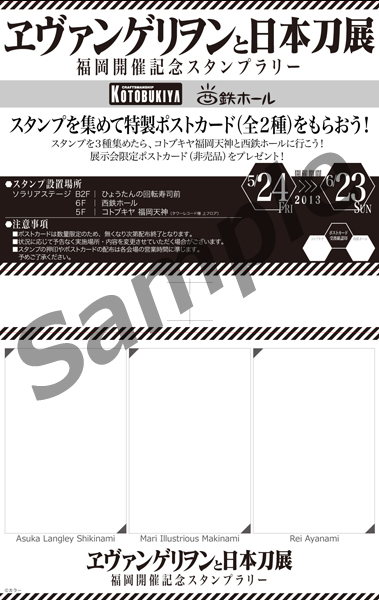 「ヱヴァンゲリヲンと日本刀展」(主催:TVQ九州放送、ラブエフエム国際放送、テレビせとうち 他)と株式会社壽屋(本社:東京都立川市曙町/ 代表:清水一行)は、「ヱヴァンゲリヲンと日本刀展」の福岡開催を記念したスタンプラリーを5月24日(金)からソラリアステージにて実施します。