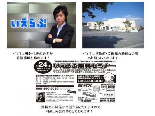 不動産業界に特化したインターネットサービスを提供する株式会社いえらぶGROUP(本社:東京都新宿区、代表取締役社長:岩名泰介)は、2013年5月24日に、立ち上げ5年で全国2000社超の不動産会社を支えるシステムを確立した、いえらぶGROUP代表 岩名泰介による成功ノウハウセミナーを沖縄県那覇市にて開催致します 。この度、東京、大阪など全国で2000社超の不動産会社様にご利用頂き、沖縄県でも昨年9月からサービスを提供させて頂き、既に約50社様にご利用頂いている不動産会社様専門のノウハウを公開致します。
