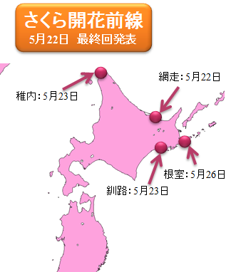 それでも、3月13日に九州の福岡、宮崎からスタートしたさくら前線はようやくゴールへ。稚内や網走、釧路でも間もなく開花する予想で、根室は5月26日の開花予想となっています。これから月末、もしくは来月初旬にかけてお花見の楽しめる所が多いでしょう。まだまだお花見を楽しみたい方は北の大地へ出かけてみてはいかがでしょうか。