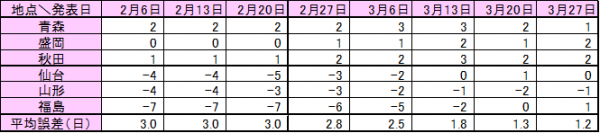 本プロジェクトのメインである東北地方の開花予想につきましては、2月6日の第1回発表より、平均誤差3日以内という高い精度で予想をすることができました。とくに東北北部の精度が高く、東北南部でも3月13日の第6回発表以降は、誤差2日未満となりました。