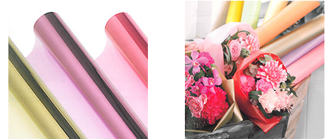 「ファンタジーラップ」はカラーセロファンのような透け感が特徴。「レインボーラップ」はワックスペーパーのようなマットな質感。いずれもシワになりにくいOPP素材を使用。OPPでは技術的に難しいとされてきた色・質感を実現した新しいフローラルペーパーです。