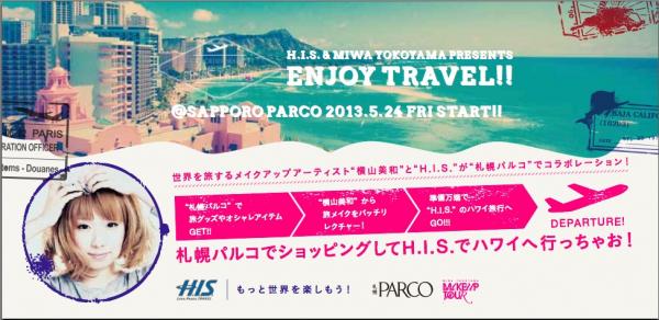その横山美和企画の第一弾として、この度、H.I.S.北海道、及び札幌PARCOと提携し、“メイクやファッションを通して旅の楽しさをお届けするイベント「ENJOY TRAVEL」”を“札幌PARCO”を会場に5月24日より7月3日迄、開催します。