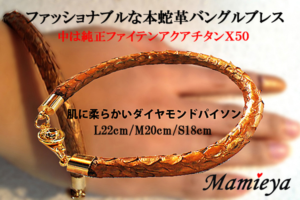 本作品:純正ファイテンアクアチタンX50入り蛇革バングルブレスは、