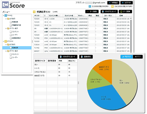 同一の管理画面上で、スライド型コンテンツ、クイズ/テスト型コンテンツの両方を取り扱うことが出来るので、両者を組み合わせた学習状況の把握もし易くなっています。また、管理者は、蓄積された学習履歴データをウェブ画面上で確認できるだけでなく、ユーザーごとやコンテンツごとにソートしCSV形式でダウンロードし分析することもできます。