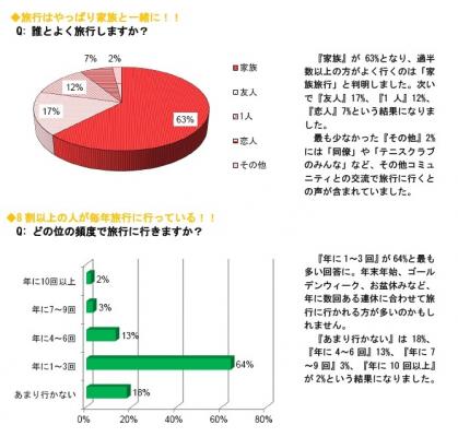 アンケートの結果、「どの位の頻度で旅行に行きますか?」との質問に『年に1~3回』が64%と最も多い回答になり、全体の82%の人が年に1回以上旅行をしていることが分かりました。また、「誰とよく旅行しますか?」との問いには『家族』が63%となりました。