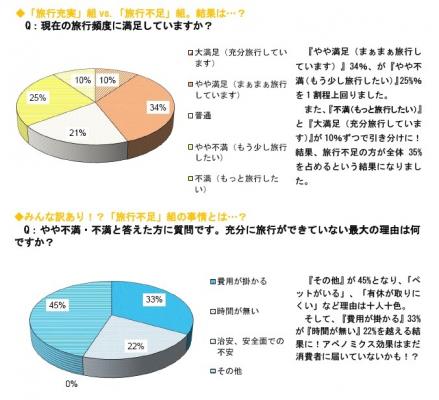 現在の旅行頻度についての質問には約4:3の比率で『大満足(充分旅行しています)』と『やや満足(まぁまぁ旅行しています)』が少し上回る結果が出ました。また、『やや不満(もう少し旅行したい)』、『不満(もっと旅行したい)』と答えた方に「充分に旅行ができていない最大の理由は何ですか?」と質問した所、『費用が掛かる』33%、『時間が無い』22%、その他「ペットがいる」、「有休が取りにくい」など様々な事情で旅行に行けない方が多いようです。