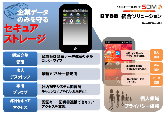 「VECTANT SDM」は、企業における大量導入が本格化しているスマートフォン/タブレット 端末の設定管理、有効活用のための機能をクラウド型でご利用頂けるサービスとして、2011年11月より提供を開始致しました。「VECTANT SDM」のサービスコンセプトは、マルチOS(Android/iOS対応)、およびマルチキャリア、マルチデバイスであり、従来型の『管理するためのMDM』とは一線を画した各種機能を提供し、『活用するためのMDM』として高い支持を得ています。今回、市場の高い注目を集めている「BYOD」に対応したメニューの追加により、多彩なオプションサービスとあわせて、より幅広いモバイルデバイス活用の統合ソリューションをご提供致します。