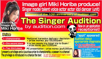 全国で音楽、歌手、シンガーソングライターを目指している女性の歌手オーディション。今回は追加2名募集します。オーディションに受かると全国音楽配信と世界ダウンロードでitune,amazon,楽天,ツタヤ,レコチョクなどのインターネットダウンロード配信で全国発売デビューが出来ます。あわせて雑誌pandaにも専属モデルとして活躍。オーディションドットコムhttp://a-audition.com
