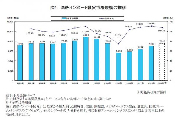 本調査における高級インポート雑貨とは、欧米から輸入された腕時計、宝飾、陶磁器、クリスタル・ガラス製品、筆記具、眼鏡フレーム・サングラス(アイウェア)、キッチンツールの7分野を指す。特に眼鏡フレーム・サングラスについては、3万円以上の商品を対象とした。