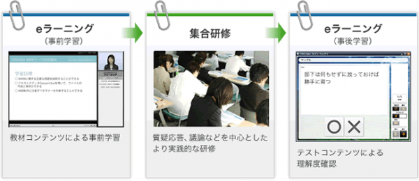 昨今、企業で実施される社員教育においては、eラーニング教材での事前学習と実会場での集合研修を組み合わせて実施されるケースが増えています。また、研修内容の理解度をチェックするために、事後にeラーニングでテストを実施するケースも多く見かけられます。