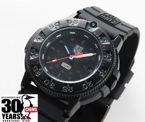 品番: CHUMS 30th Anniversary Luminox Watch/価格: ¥39,900(税込)/発売:2013年6月8日/限定300本、裏蓋にシリアルナンバー付/セット:特製替えベルト(3種)、特製ポーチ付/ムーブメント:RONDA515(クオーツ) /電池寿命:製造から約4年/ケース:カーボンファイバー/ケース幅・厚:43mm・11mm/ガラス:ミネラルクリスタルガラス/防水:200m・20atm/重量:27g(ベルト含まず) /ベゼル:逆回転防止機能/ベルト:ウレタンラバー/スイスメイド
