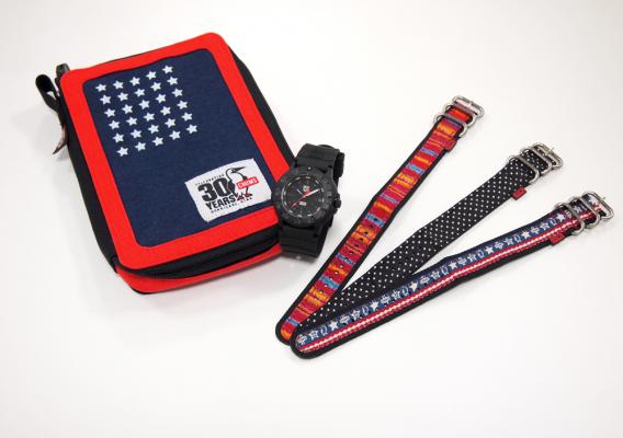 文字盤はシンプルにトーンを落としつつも、アメリカ国旗カラーの針がアクセントとなり、米国ブランドらしさも溢れるデザインに仕上がりました。本数は300本限定シリアルナンバー入り、30周年特製ベルト3本とポーチ付。身に着けるだけで夜のキャンプがもっと楽しくなること間違いありません!