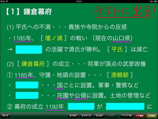 1) 教材・資料(PDF,Jpeg,PNG)の隠したい場所に付箋を貼り、保存することができる (ブリーフケース)