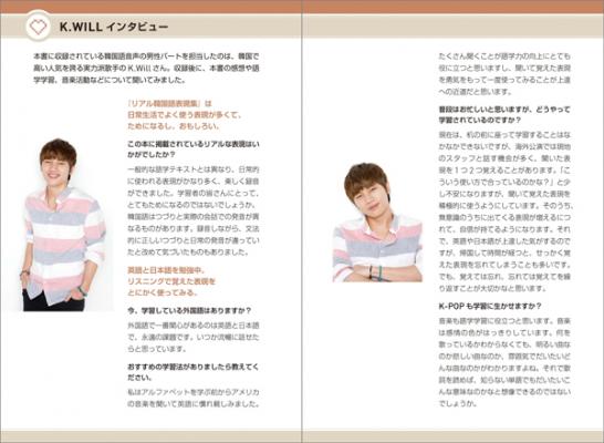 韓国の実力派男性歌手。1981年12月30日生まれ。2007年にアルバム「左側の胸」でデビュー。ドラマ「華麗なる遺産」「最高の愛」などの挿入歌を担当。『韓国語ジャーナル』(アルク)人気コンテンツ「K.WillのVoice of KJ」を担当。