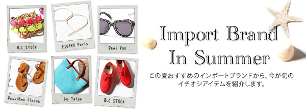 株式会社ベイクルーズグループ(東京都渋谷区、代表:窪田 祐)は、公式通販サイト「スタイルクルーズ」にて、2013年夏、おすすめのインポートブランドから、最旬アイテムを一挙にラインナップした“Import Brand in Summer”コレクションをスタートいたします。JOURNAL STANDARD、Spick and Span、IENA、EDIFICE、Deuxieme Classeはじめ、スタイルクルーズの20ブランドから、この夏おススメの最旬インポートアイテムが顔を揃える、サマーアイテムコレクションです。
