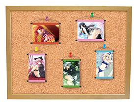 ・ミニサイズであるために、場所を気にすること無く、たとえばコルクボードなどに写真のように多数貼付して飾るなど、今までの大きな壁掛けキャラクタータペストリーとは違う、箱庭的な展示の楽しみなど幅が広がります。