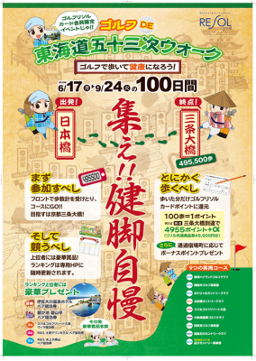 ゴルフ場やホテル・旅館等の運営を通してリゾートの再生・活性化を推進するリゾートソリューション株式会社(略称・リソル、東京都新宿区、多賀道正社長)では、健康志向が高まる昨今、ゴルフとウォーキングを結びつけたユニークな健康企画『ゴルフDE 東海道五十三次』を全国のリソルグループゴルフ場のうち関東の9コース(別記)で開催いたします。開催期間は6月17日(月)より9月24日(火)までの100日間です。
