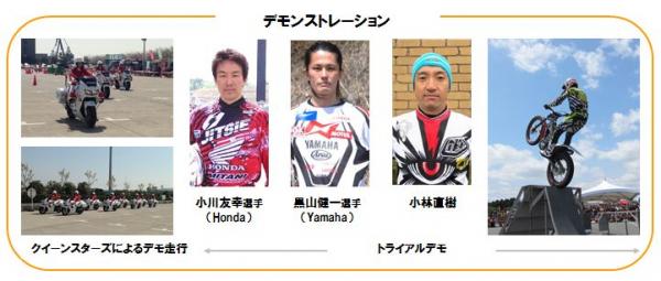 当日は、トリノ五輪金メダリストで、現在プロフィギュアスケーターの荒川静香氏や東北大学 教授・川島隆太氏、元レーシングライダー・中野真矢氏らを迎えての“「私とバイク」を考える”をテーマとしたトークショー、警視庁協力による女性白バイ隊 「クイーンスターズ」のデモ走行、東京湾岸警察署の「二輪車交通安全講座」、2012年度MFJ全日本トライアル選手権シリーズランキング1位・黒山健一選手と2位・小川友幸選手によるトライアルデモ等の開催を企画しております。