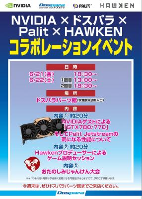 全国21店舗及びウェブ通販のパソコンショップを運営する株式会社ドスパラ(代表取締役社長:尾崎健介、本社:東京都千代田区)は、2013年6月21日(金)と22日(土)、ドスパラ パーツ館(東京・秋葉原)店頭にて、「 NVIDIA(R) × ドスパラ × Palit(R) × HAWKEN 」によるコラボレーションイベントを開催いたします。