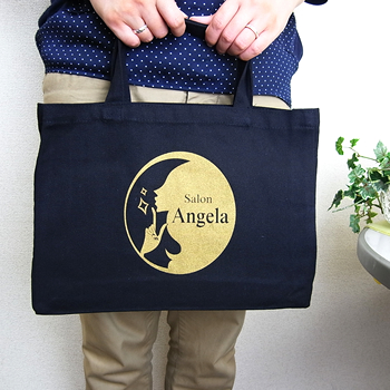 ネイルとエステのサロンを併設する、泉佐野市のネイルスクールが制作したオリジナルバッグ。黒の生地にゴールドのロゴをあしらい、シックで癒される店内のイメージを表現。受講生の通学用として、或いはお客様へのノベルティとしてご活用中とのことです。