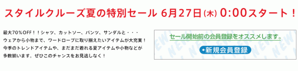 株式会社ベイクルーズ(東京都渋谷区、代表:窪田祐)が運営するファッション通販サイト「StyleCruise|スタイルクルーズ(http://style-cruise.jp/)」は、2013年6月27日(木)午前0時より夏のセール「Style Cruise 2013 SUMMER SALE」を開催いたします。JOURNAL STANDARD、Spick and Span、IENA、EDIFICEなど人気ショップの夏の新作・定番アイテムなどが最大で70%OFFになります。この機会にぜひスタイルクルーズでのショッピングをお楽しみください。
