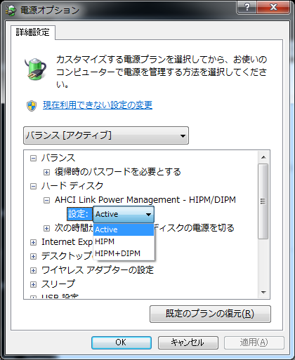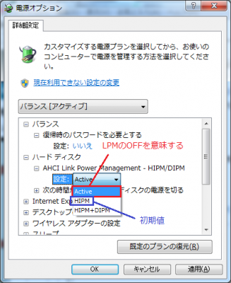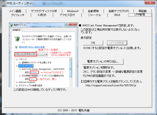 ワンタッチ操作により、LPMの設定Windows7の場合は、[コントロールパネル] -> [電源オプション] -> [プラン設定変更] -> [詳細な電源設定の変更]より設定制御出来るようになります。