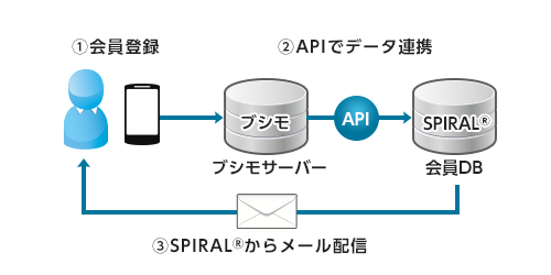 「スパイラル(R)」を導入したブシモの配信基盤では、会員マスタである基幹ブシモサーバーと「スパイラル(R)」がAPIで連携しています。ブシモに会員登録があると、スパイラル(R)APIを通して、「スパイラル(R)」のDBに登録データが格納されます。そして「スパイラル(R)」の配信機能を用いて会員にメールマガジンなどを送信しています。また、メールマガジン解除をブシモサーバーにて受け付けた際は、スパイラル(R)APIを通して解除フラグの同期を自動で行い、データを連携しています。