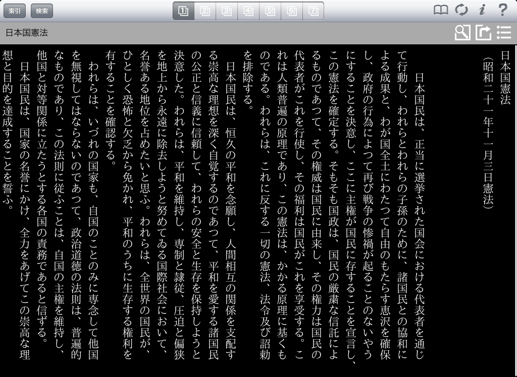 無償iPad 版『電子法令検索』は、六法をはじめとした約7,800 法令(憲法・法律・政令・勅令・府令・省令)をiPad上で簡単に検索・閲覧できる法曹関係者、実務家、そして研究者、学生の皆さんのための『電子法令検索』です。今回のアップデートで、iOS6に対応、平成25年3月1日までの官報掲載法令(総務省行政管理局が整備しているデータ)を搭載、文字の種類にゴジックを追加し、明朝と切替が可能となりました。