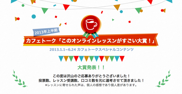 カフェトークでは、2013年1月~6月に受講されたオンラインレッスンを対象として、生徒様からの投票数・レッスン受講数・口コミ評価を加味して採点・選考の上、2013年上半期に最も支持されたカフェトークのオンラインレッスンを発表させて頂きました。