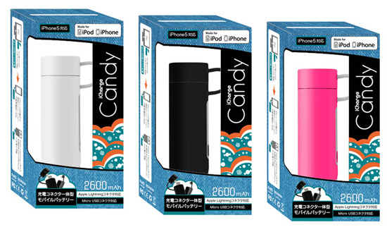 iCharge Candyは、各種安全認証・適合を取得したiPhone 5完全対応の充電コネクタ一体型モバイルバッテリーです。アップル社が定める互換性要件、性能基準を満たす認証「Made for iPhone/iPod」を取得しています。出力コネクタは、Apple社の認証を取得したLightningコネクタとmicro USBコネクタを搭載しています。iPhone 5をはじめとするLightningコネクタ搭載機器、MicroUSBコネクタを採用するスマートフォンやモバイル機器等へ充電が可能です。ホワイト、ブラック、ピンクからお好みのカラーをお選びいただけます。