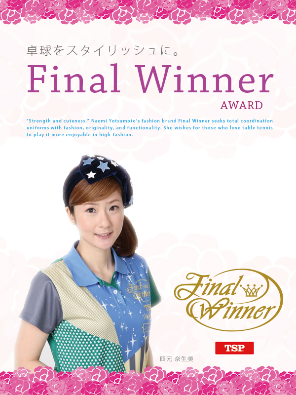 この「Final Winner アワード」は、四元奈生美選手が立ち上げたブランド「ファイナル ウィナー」の「強くてカワイイ」をコンセプトに、卓球をもっとスタイリッシュにするTシャツデザインを募集します。また、ソーシャルメディアを活用したスコアリング(人気投票)を行い、受賞デザインを選びます。
