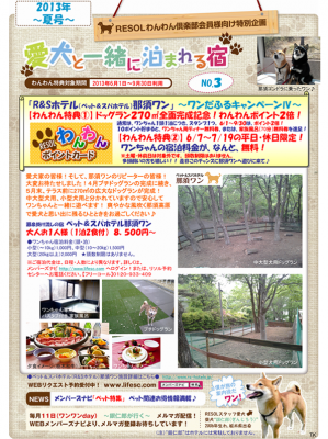リソルでは現在、直営「ペット&スパホテル那須ワン」が特別優待料金で利用できるほか、全国100カ所以上のペットと泊まれる宿が優待料金で利用可能など、愛犬家にとっては嬉しい5大特典付きの『わんわん倶楽部』の会員募集(登録無料)をしております。