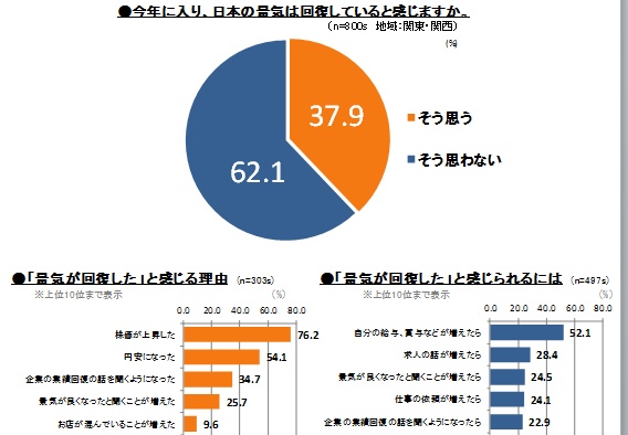 「景気が回復している」(37.9%)と感じるものは、「株価の上昇、円安」などニュースに基づく判断をしており、「回復していない」(62.1%)と感じるものは、「自分の給与、賞与などが増えたら」といったより直接的な影響を元に判断。
