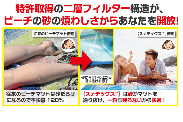 ビーチの砂が下に抜け落ちる特別な織り方がほどこされた、【スナテックス・レジャーマット】