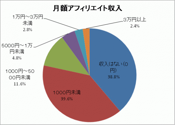 アフィリエイト収入の面では、月3万円以上のアフィリエイト収入があるのは全体の2.4%、アフィリエイターの約8割が収入1,000円未満という調査結果となりました。