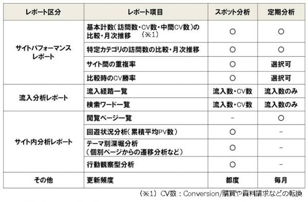 今回追加する定期レポートとは、2013年2月よりスタートしております「競合サイト分析サービス」の分析項目のうち、競合各社のパフォーマンスを評価する指標に絞り、より短いサイクルで定期レポートしていくサービスです。
