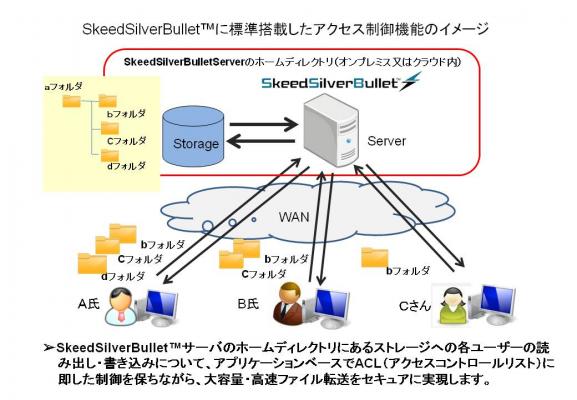 このたび、こうした特長、用途にさらに広がりを持たせるべくACL機能を追加し標準搭載いたしました。同機能はSkeedSilverBulletTMがインストールされているサーバのホームディレクトリ配下のストレージへのアクセスにおいてユーザー権限に応じたアクセス制御を可能にするもので、個々のユーザーへの多段階にわたるディレクトリ内での制御を実現します。