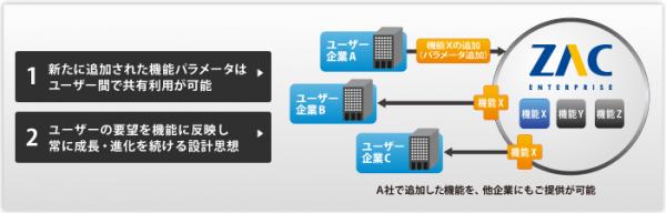 ZACはユーザー企業個々の要望に対して、パッケージ内部のパラメータを設定することにより機能適合するため、個別開発を必要とする従来システムに比べ、低コスト・短期間でのERP導入を実現しています。パラメータはユーザーの要望を反映し日々追加されるため、常に成長・進化を続ける設計となっています。