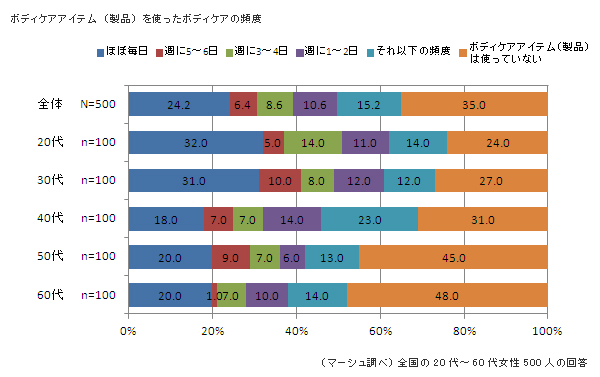 まず、ボディケアアイテム(製品)を使ったボディケアを行っている頻度を聞いたところ、「ほぼ毎日」と答えた女性は全体の24.4%で約4人に1人。60代の女性では、「ボディケアアイテムは使っていない」と答えた人が48.0%で半数近くを占めました。