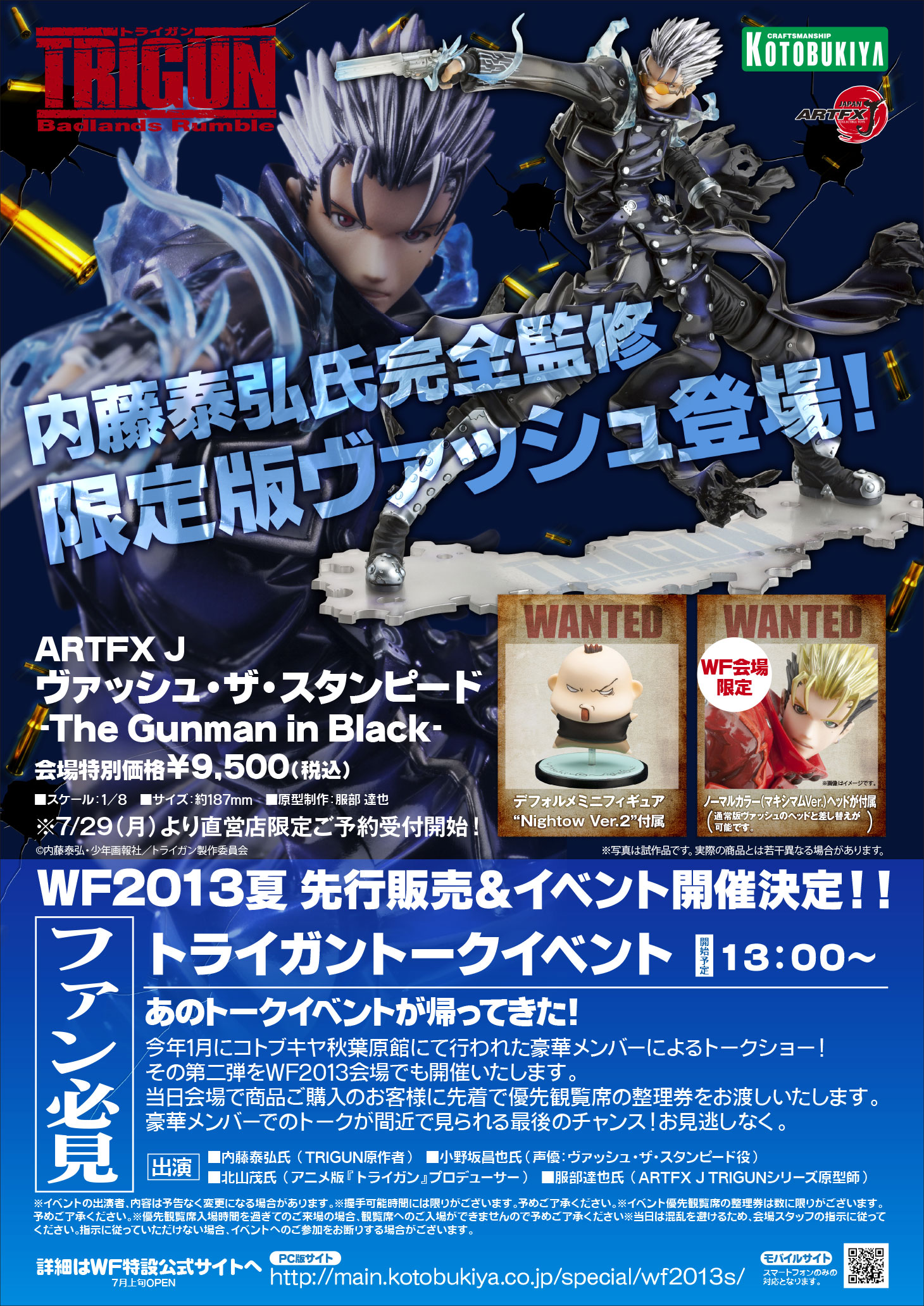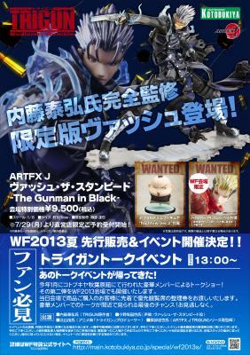 2013年夏以降の新商品展示や当日会場での新商品発表、さらに「ARTFX J ヴァッシュ・ザ・スタンピード -The Gunman in Black-」の先行販売などを予定。WF会場でご購入いただくと、限定の「ヘッドパーツ」が付属します。販売に合わせ、原作者「内藤泰弘」さん、ヴァッシュ役:声優「小野坂昌也」さん、アニメプロデューサー「北山茂」さん、原型師「服部達也」さんをゲストに迎えてのトークイベントやプロモデラー「オオゴシトモエ」さんをゲストに迎えた可動フィギュア「キューポッシュ」シリーズのイベントも予定しております。ぜひ、お客様お誘い合わせの上、コトブキヤブースにお越しください。