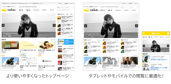 cakesでは、ビジネス、IT、エンタメ、マンガ、雑誌などを中心に、多彩なジャンルのコンテンツを配信しています。リニューアルサイトでは、リコメンド機能の充実やクリエイターページの新設などにより、見たいコンテンツによりたどり着きやすくなりました。また、スマートフォンやタブレットからの閲覧にも最適化した表示になっております。