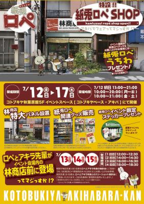 また、イベント開催期間中、13日・14日・15日限定でロペ&アキラ先輩(着ぐるみ)が登場します!そして二人が通う駄菓子屋「林商店」特大パネルもコトブキヤ秋葉原館に出現予定。パネルの記念撮影は自由なので、ファンの皆様は是非ともロペとアキラ先輩の日常を体験して下さい。期間中、紙兎ロペグッズご購入のお客様に「紙兎ロペうちわ」をプレゼント。さらに2,000円ご購入ごとに「イベント限定ステッカー」をプレゼントいたします。こちらは数量限定、無くなり次第終了となります。イベントは開店時より閉店時間まで開催される予定です(※初日のみ13:00展示開始となります)