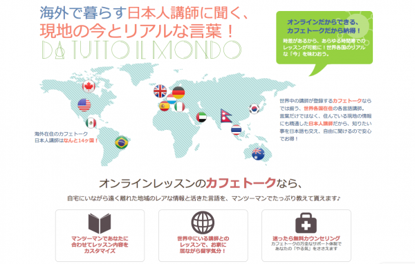 「カフェトーク」とは、スカイプを使って、世界中の講師からマンツーマンのオンラインレッスンが受講できるサービスです。