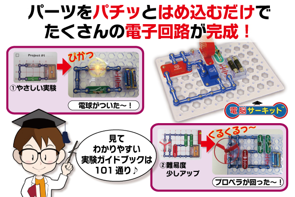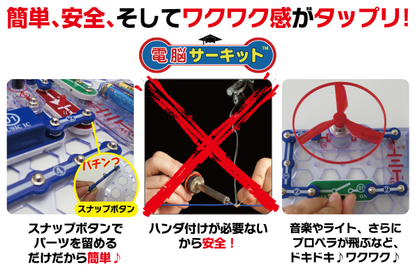 文字を読む必要がなく、図の通りに組み立てていけば、それぞれの電子回路(乾電池を使う)が簡単に完成します!